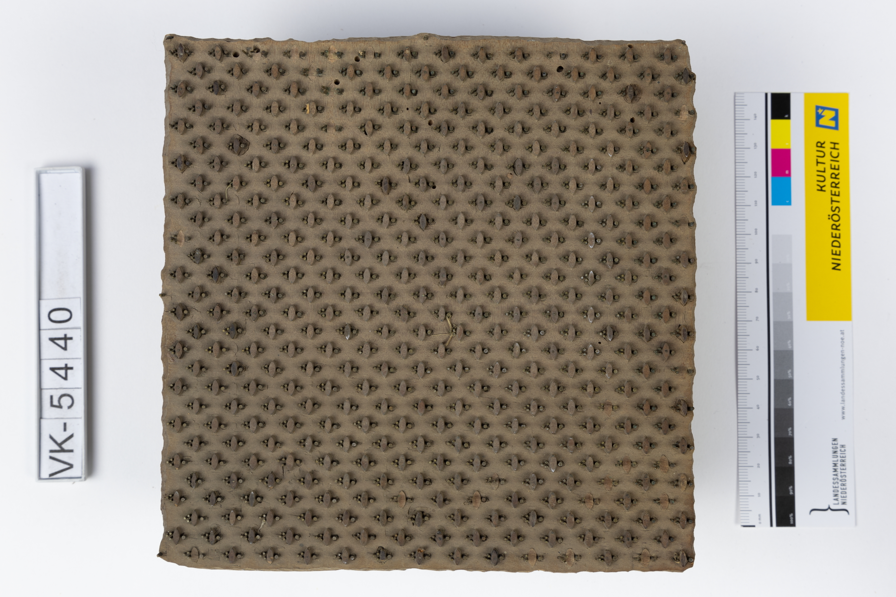 Färbermodel aus Holz mit Metallstiften auf einer Trägerplatte mit zwei Kerben. Druckmuster: Linsenförmige Elemente, (Muster Nr. 90 des Druckers).