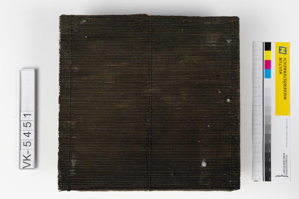 Färbermodel aus Holz mit Metallelementen und zwei Kerben. Druckmuster: Gerade feine Linien (Muster Nr. 104 des Druckers), mit Resten dunkler Farbe.