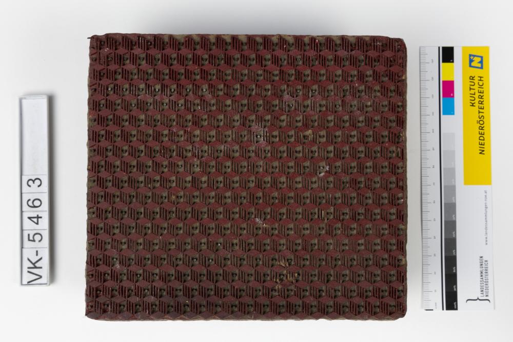 Färbermodel aus Holz mit Metallstiften und zwei Kerben. Druckmuster: Volle, gestreifte und gepunktete Rauten, (Muster Nr. 41 des Druckers), mit Resten roter Farbe.
