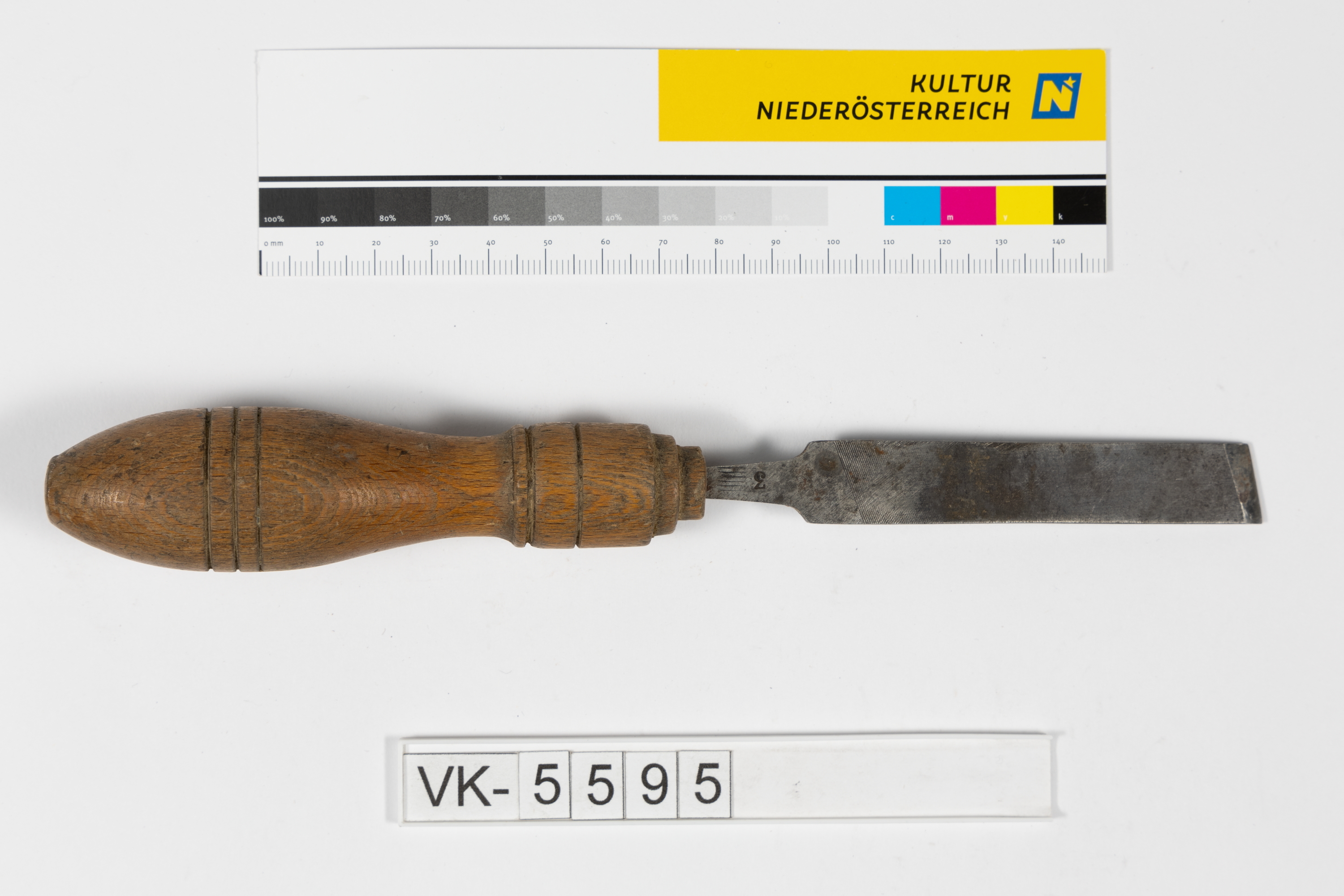 Breiter Meißel in einem gedrechselten Holzgriff, der im oberen Drittel verbreitert ist und drei umlaufende Rillen aufweist.