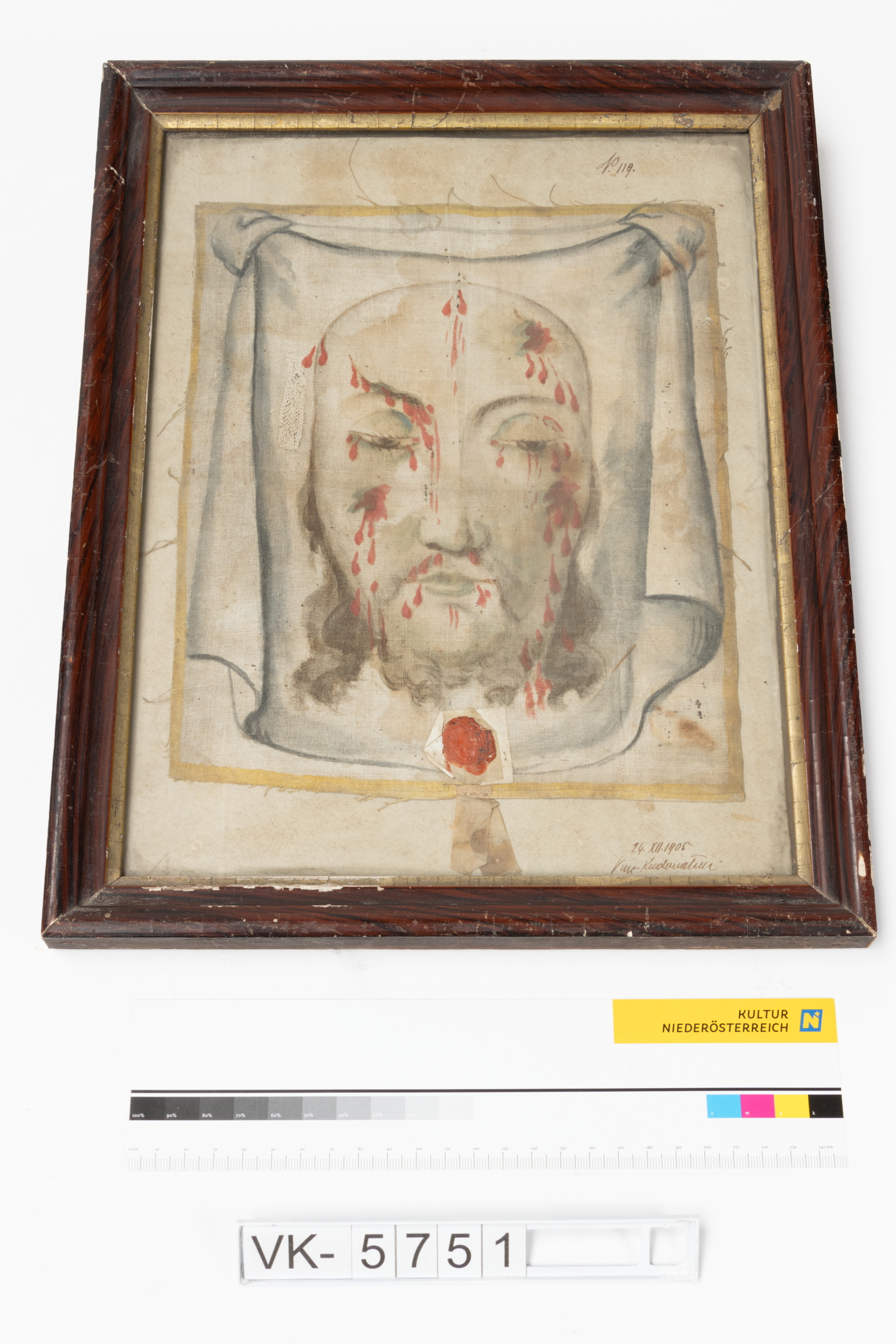 Malerei in einem braun-goldenen Holzrahmen hinter Glas: Schweißtuch Christi auf Leinen gemalt mit einem Siegel, signiert Vinz. Kudernatsch, 24.12.1905