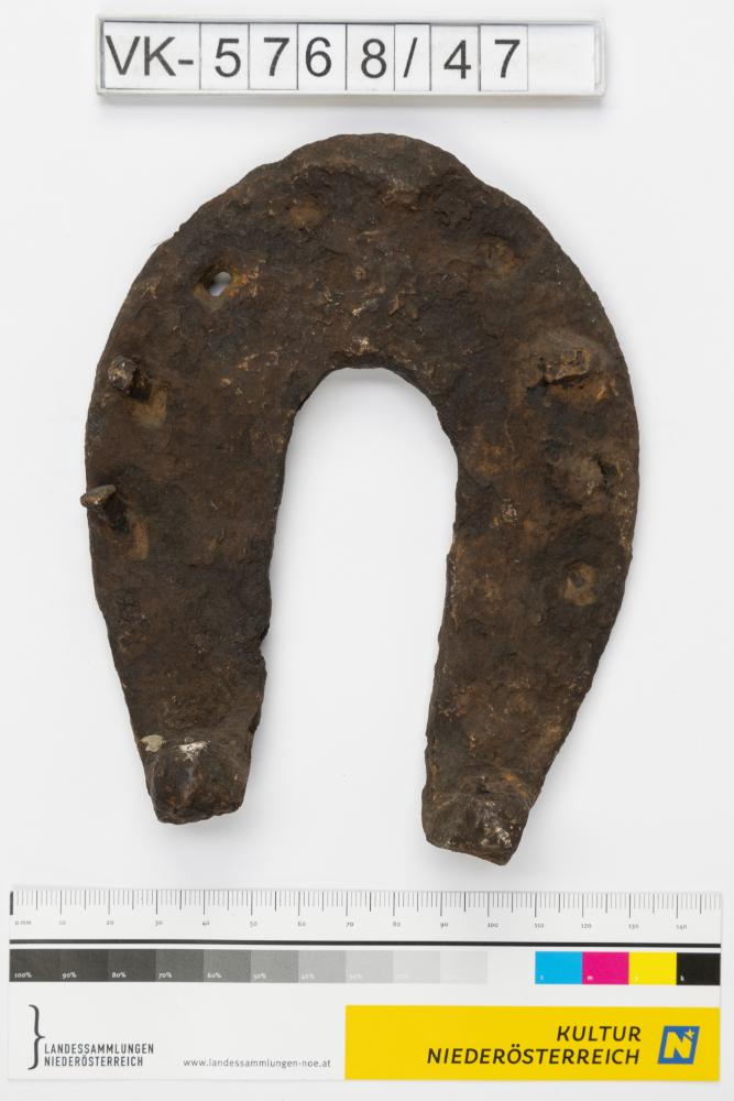 Hufeisen mit Löchern für Nägel, laut Inventarbuch großes Eisen; möglicherweise 12.-13. Jhdt.