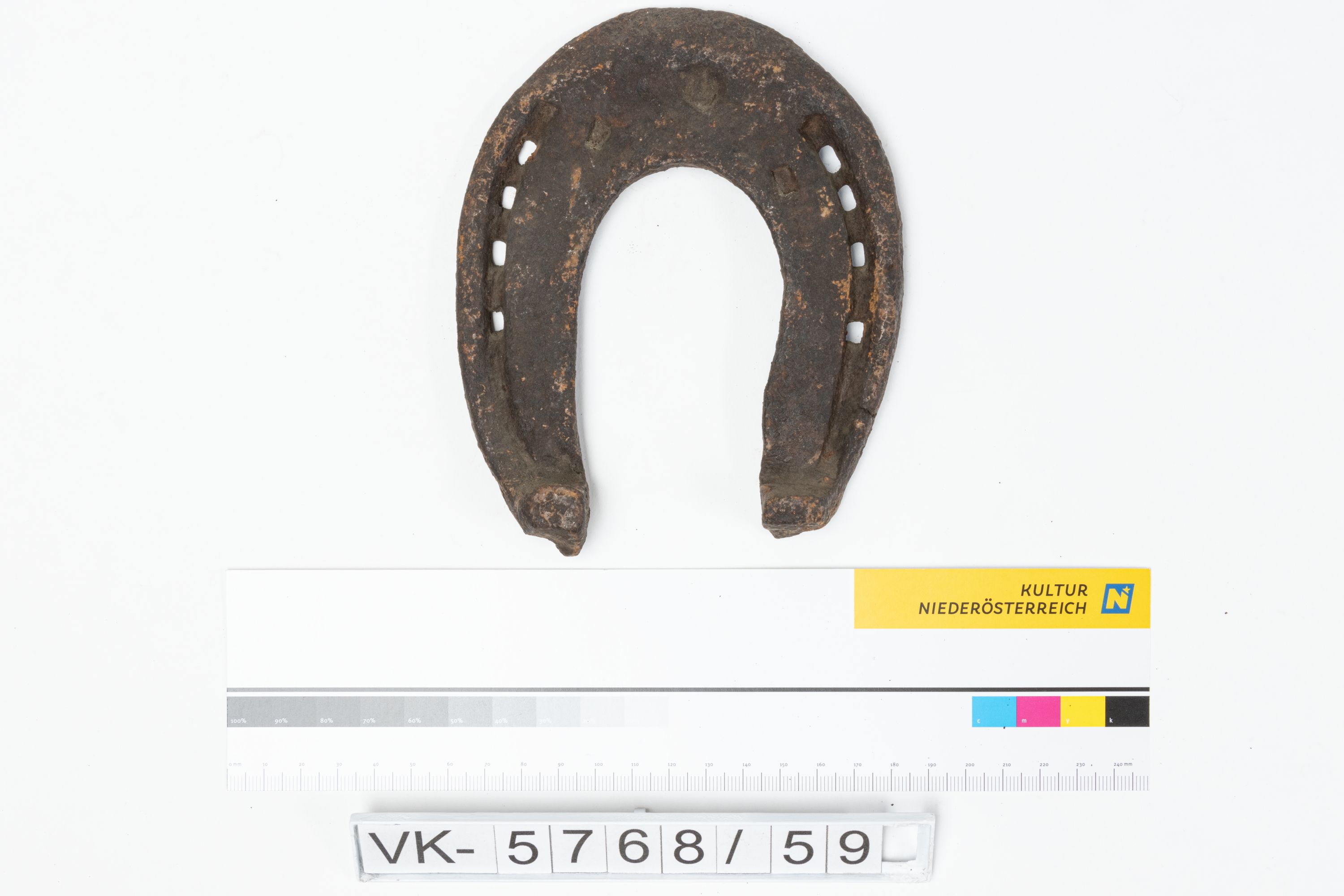Hufeisen mit Löchern für Nägel. Laut Inventarbuch mit Schmiedezeichen. 1907 gefunden.