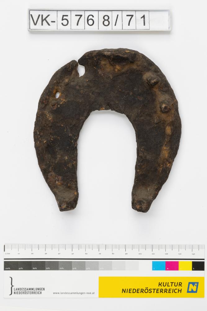 Hufeisen mit Löchern für Nägel und einer Zehenkappe, laut Inventarbuch Eisen mittlerer Größe.