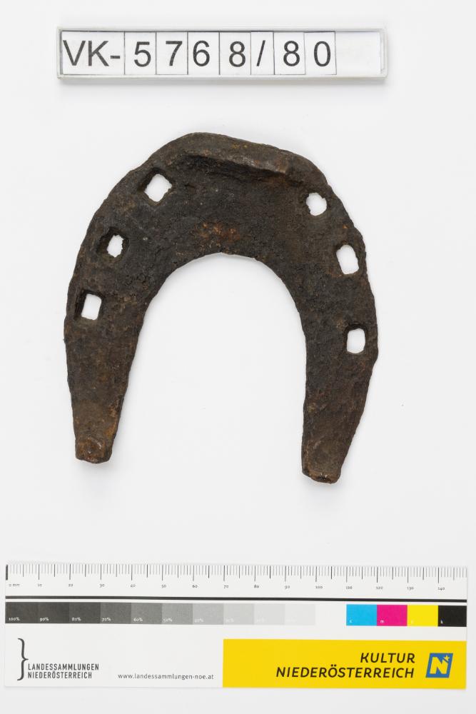 Hufeisen mit Löchern für Nägel und einer Zehenkappe, laut Inventarbuch Eisen mittlerer Größe, gefunden 1905.
