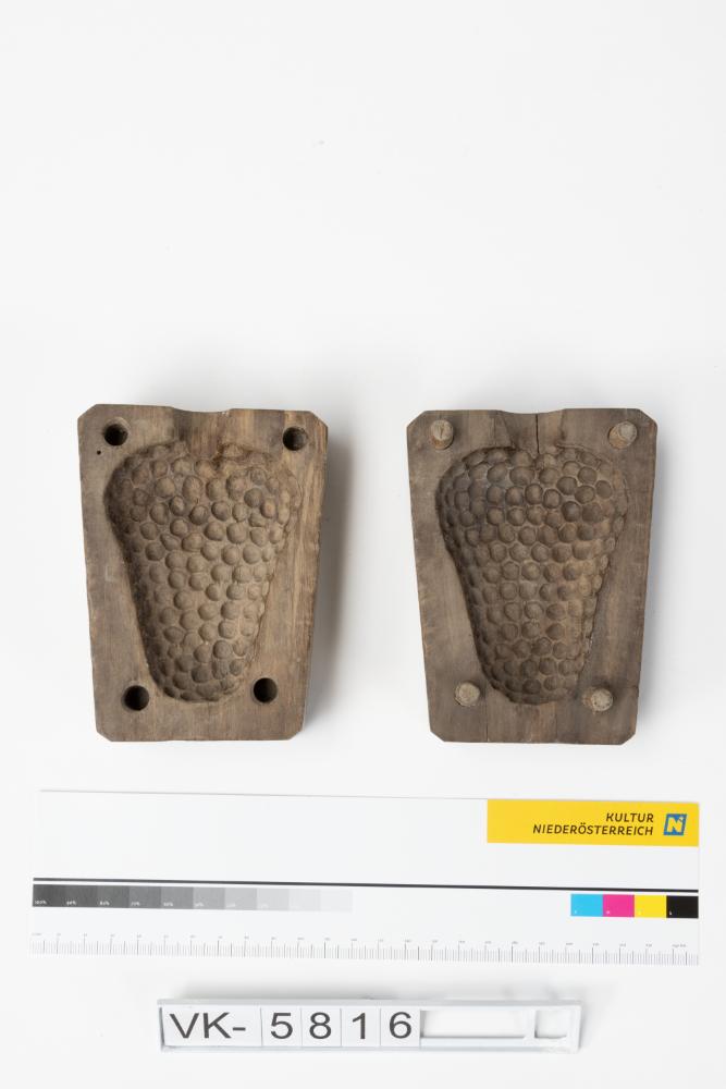 Zweiteiliges, hölzernes Lebzeltermodel mit Passstiften und je einer halben Negativform einer Traube oder Erdbeere.