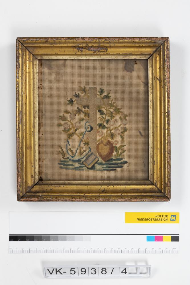 Stickerei auf gelochtem Papier in einem vergoldeten Holzrahmen mit Glas: Kreuz mit flammendem Herz und Ranken.