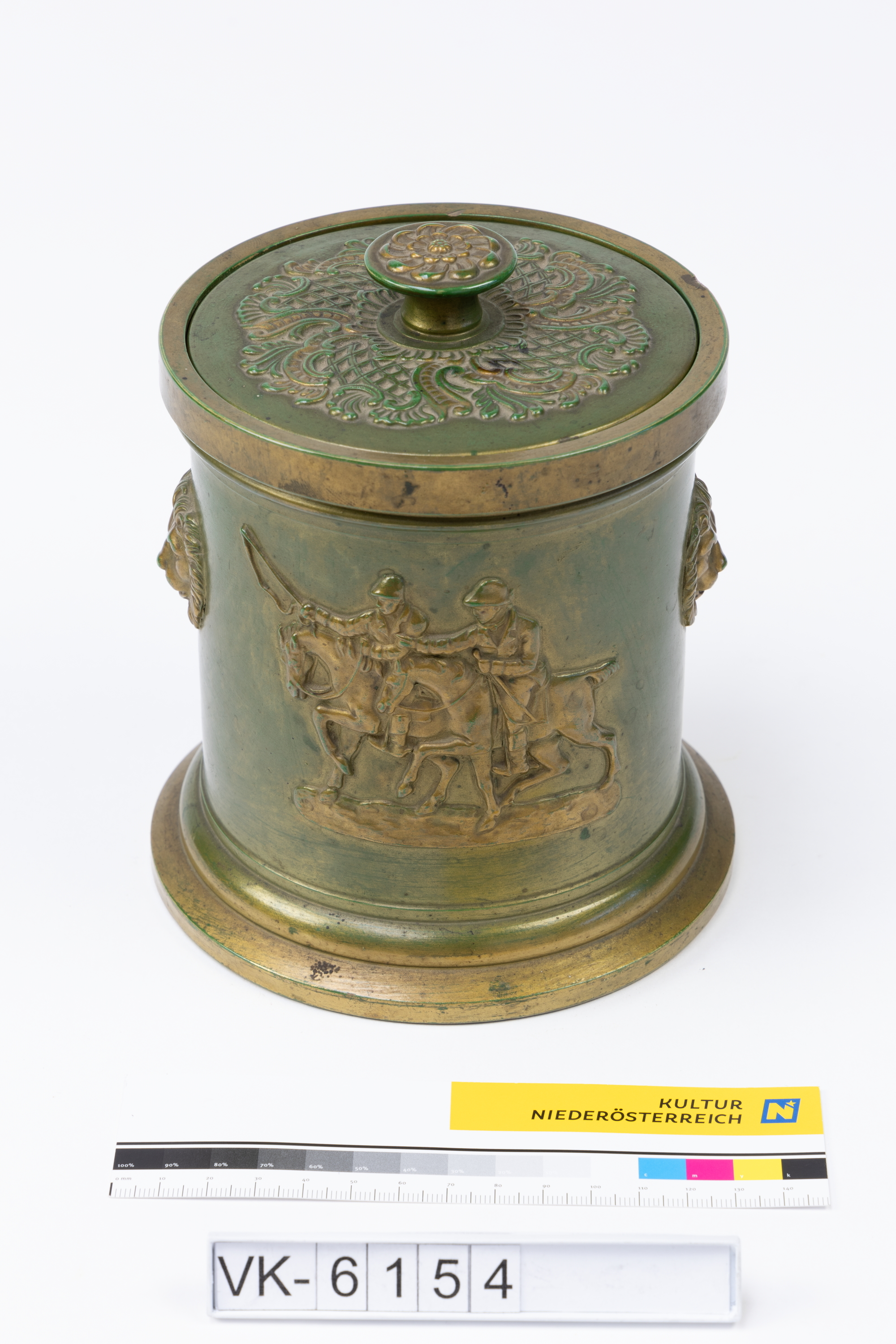 Zylindrische Dose (VK-6154a), in grün und gold bemalt, mit Reliefs: Zwei Löwenköpfe und Soldaten zu Pferd. Die Dose hat einen ornamental verzierten Deckel (VK-6154b) mit Knauf.