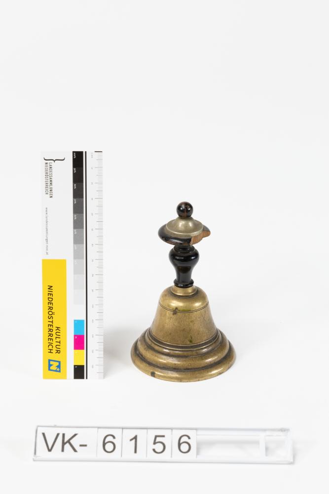Kleine Tischglocke aus Messing mit einem schwarz lackierten, gedrechselten Holzgriff.