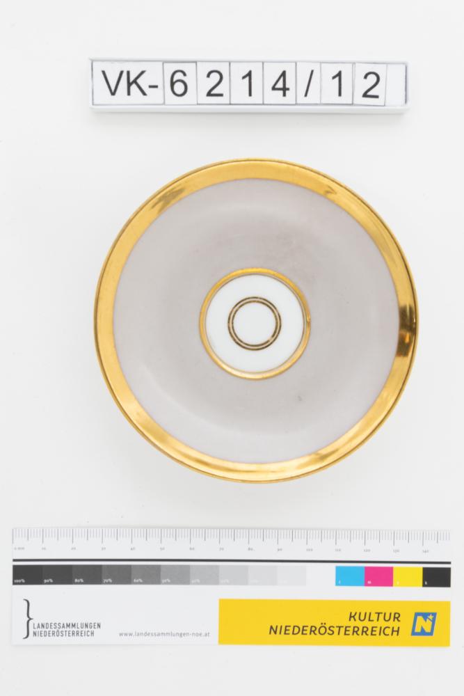Untertasse mit goldenen Ringen am Spiegel und einem breiten Goldrand.