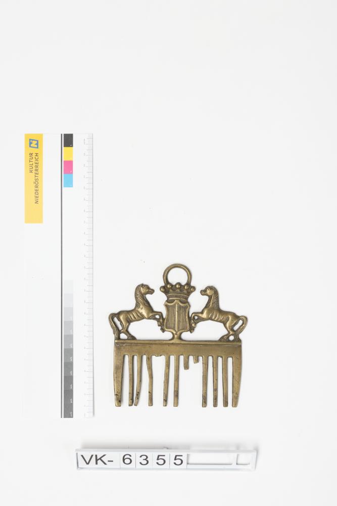 Kummetkamm mit einem Wappen, einer Öse und zwei springenden Pferden.
