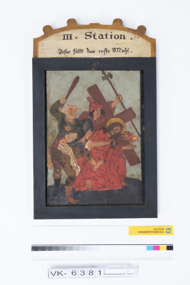 Kreuzwegstation: Auf Pergament gemaltes mehrfärbiges Bild (laut Inventarbuch vermutlich nach preußischem Vorbild) in einem schwarzen Holzrahmen mit Aufsatz und der Darstellung des stürzenden Jesus. Auf dem Aufsatz befindet sich die Aufschrift: "III. Station. Jesus fällt das erste Mahl."
