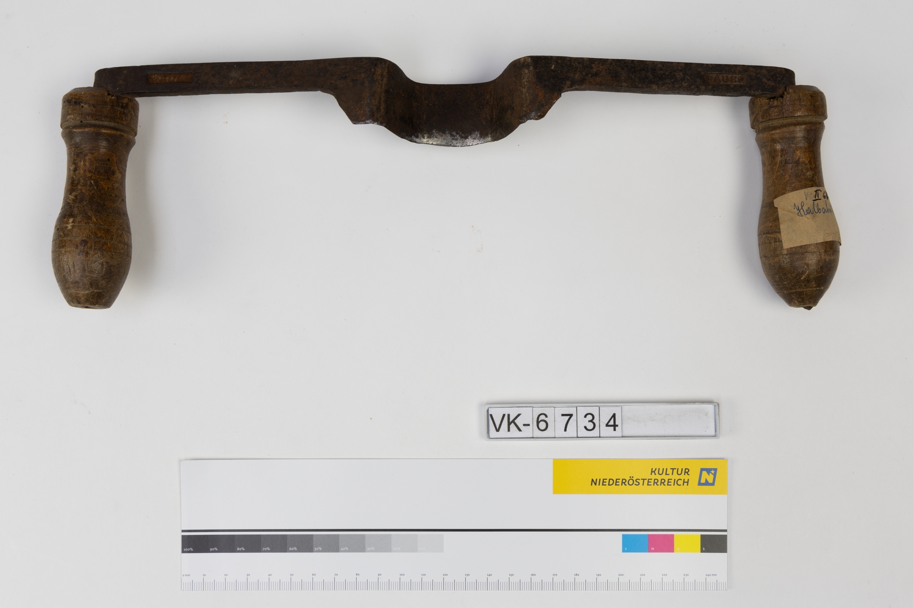 U-förmiges Reifmesser mit rechtwinkelig angesetzten Holzgriffen und Schmiedezeichen.