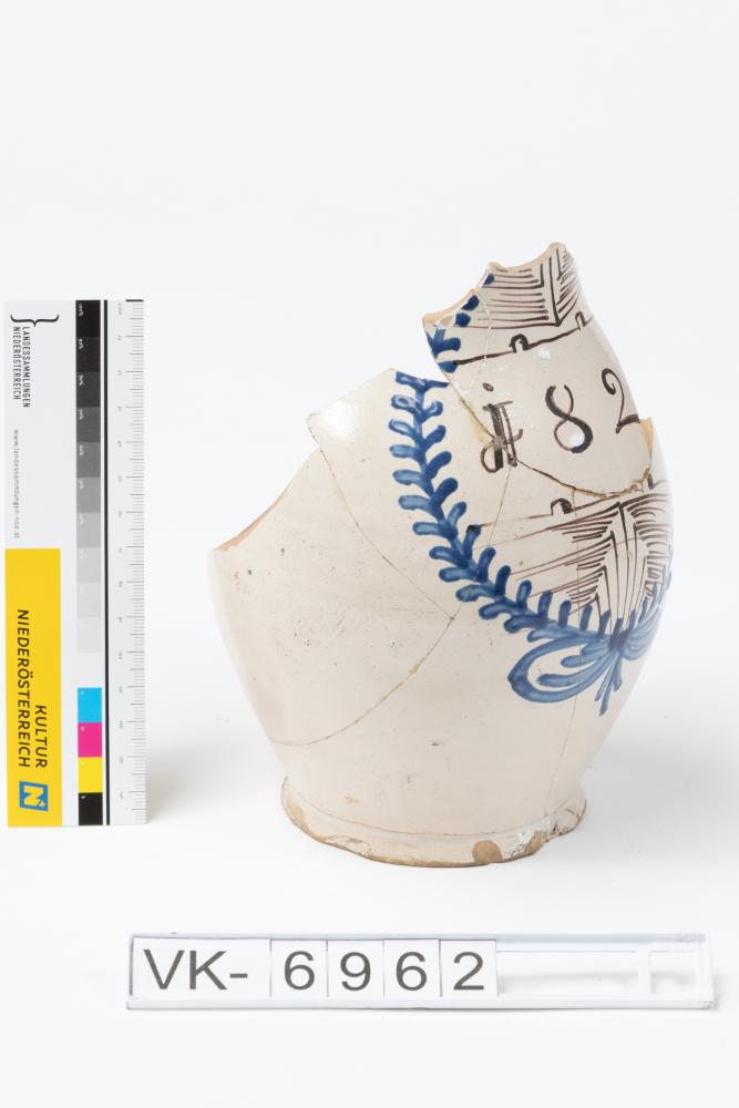 Teile eines bauchigen Kruges mit zweifärbiger Bemalung und Datierung.