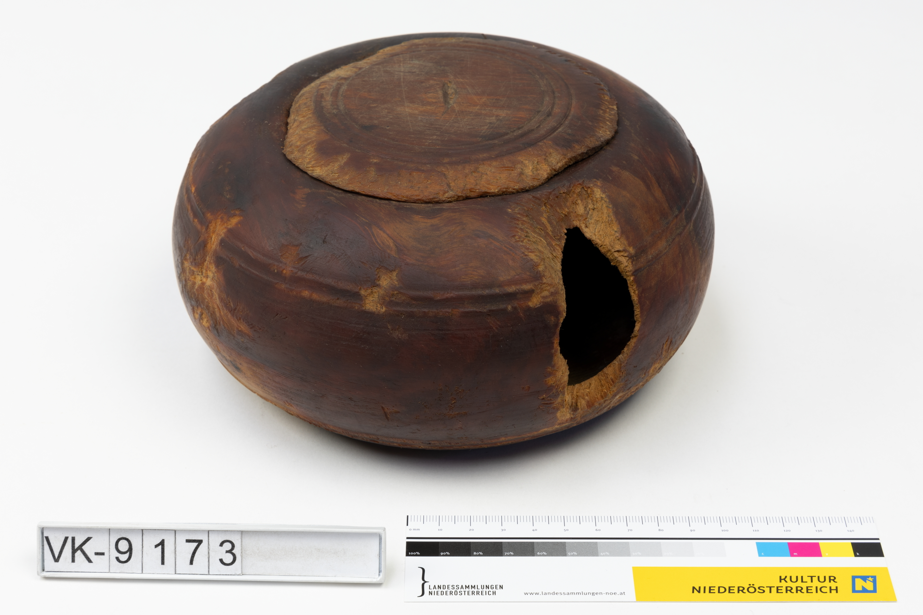 Runder, annähernd kugeliger Schmalztopf mit einem Deckel und zwei umlaufenden Rillen.