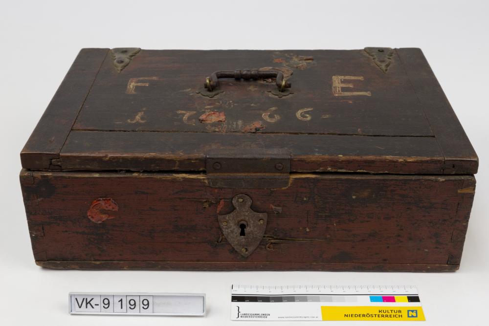 Holzschatulle mit Klappdeckel und Schloss, einige Siegelreste und eine aufgemalte Beschriftung: "FE 1766".