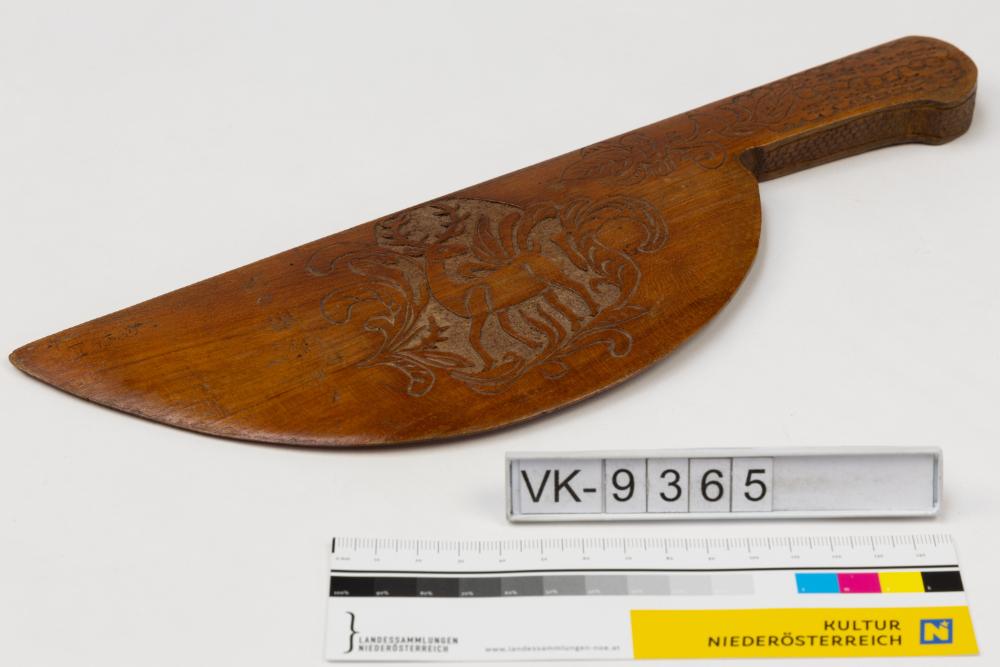Beschnitzter Rahmstreicher mit Schlagstempelverzierung. Darstellungen: Auf einer Seite Blüten und Blätter, "MW"; auf der anderen Seite ein Hirsch.