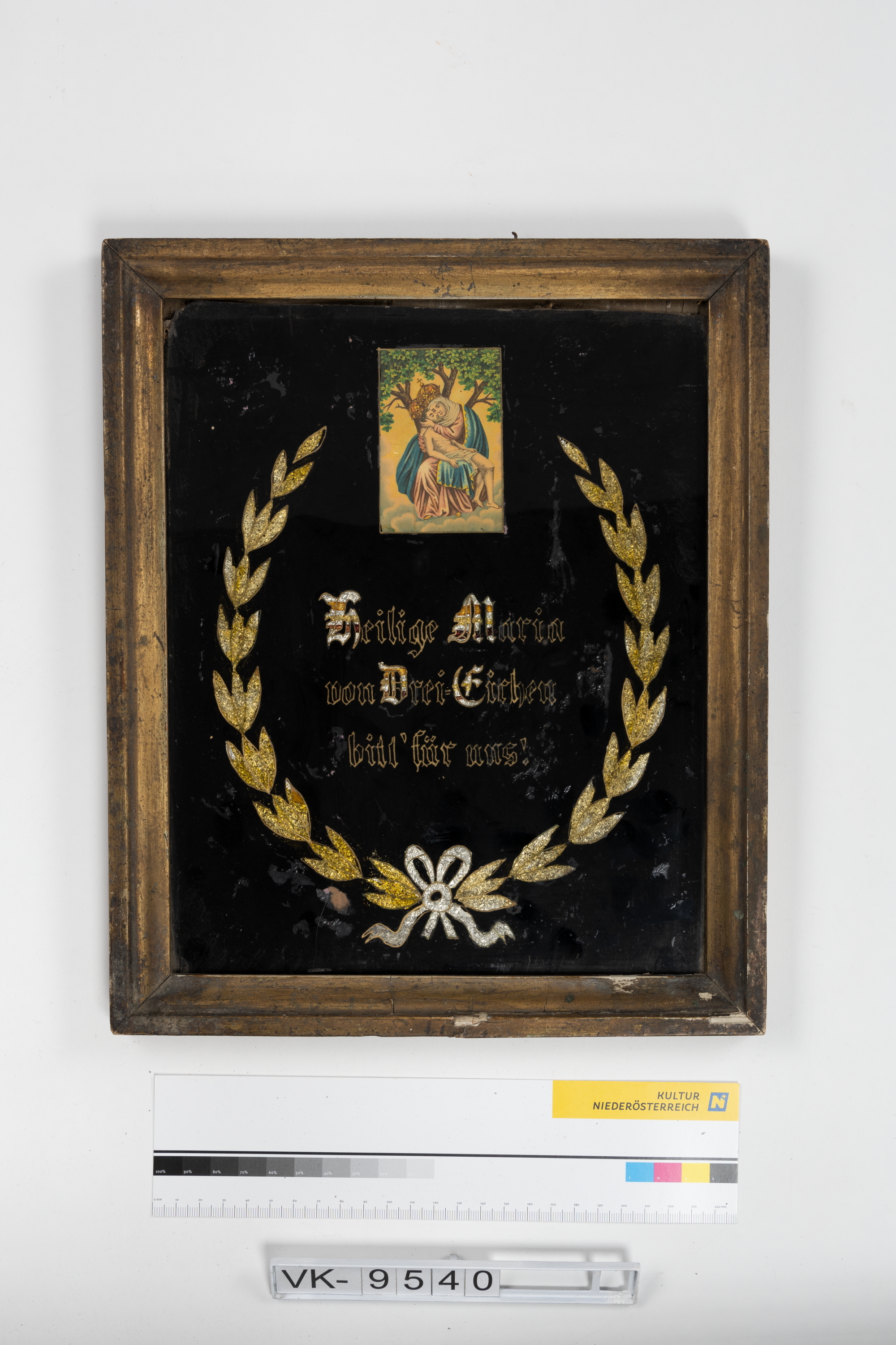 Andachtsbild hinter Glas: Kleines Andachtsbildchen (mehrfärbig, von Maria Drei-Eichen; Pieta) über einem Kranz und der Aufschrift: "Heilige Maria von Drei-Eichen bitt für uns!". Der Hintergrund ist schwarz, der Kranz ist mit Folie hinterlegt.