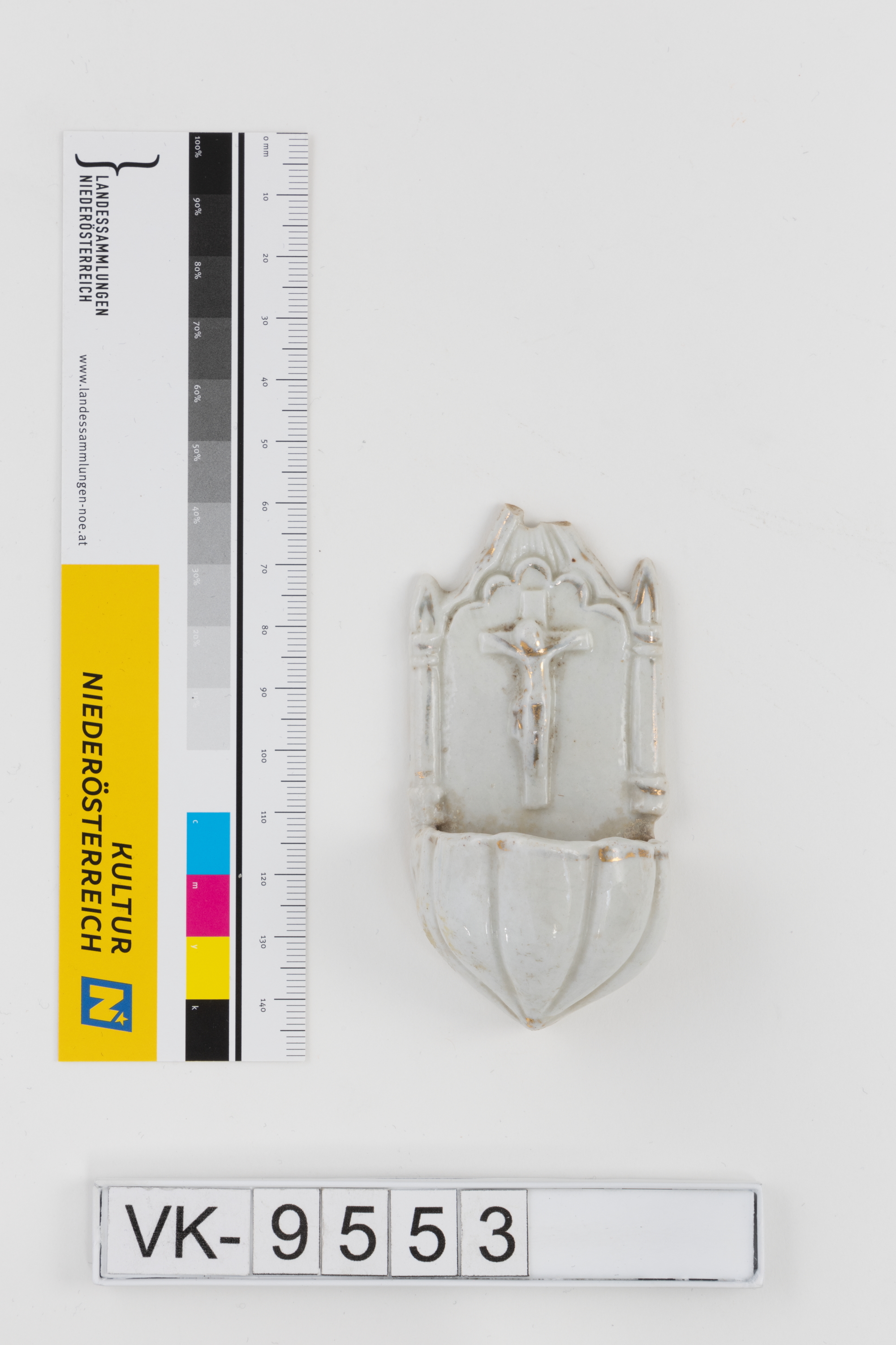 Kleiner Weihbrunnkessel mit Kruzifix und halbrundem Behälter; auf dem Weihbrunnkessel sind Reste einer Goldverzierung erkennbar.