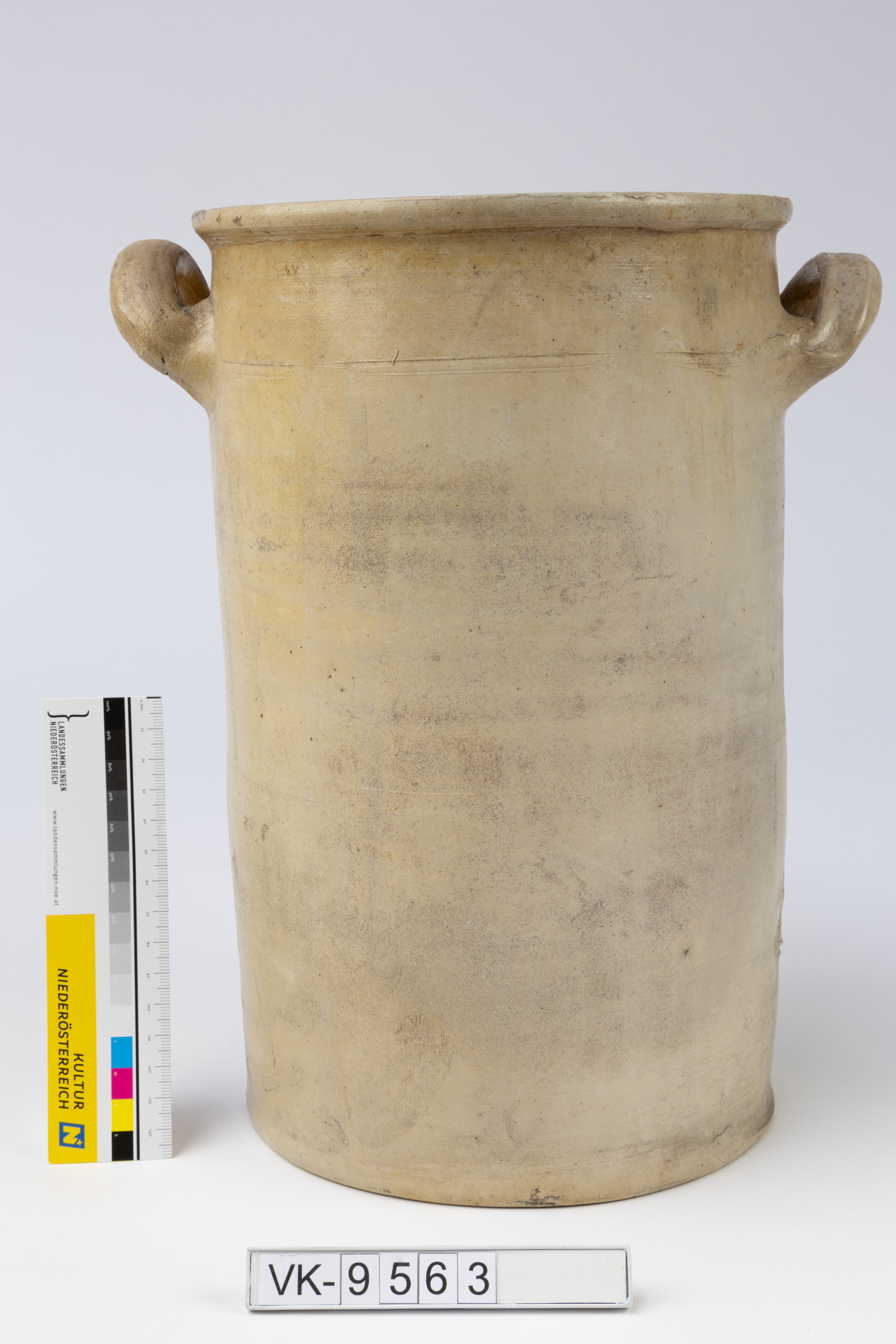 Zylindrischer, weißlich glasierter Schmalztopf ("Schmalzdestn") mit zwei unterrandständigen Henkeln.