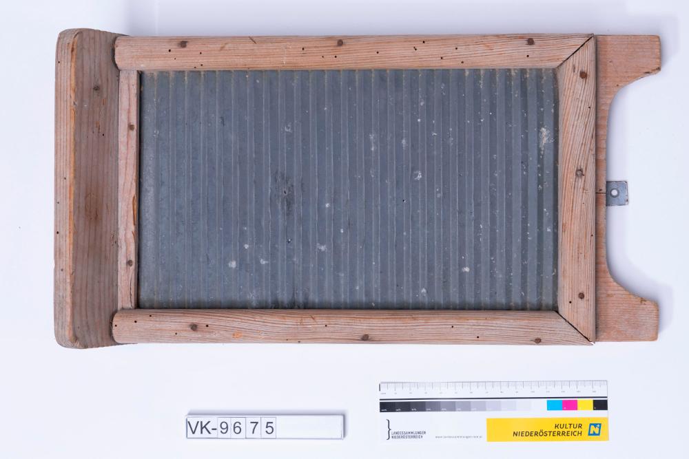 Kinderwaschrumpel aus Blech in einem Holzrahmen.