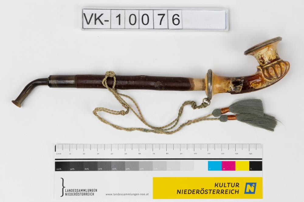 Kleine aus Bein geschnitzte Pfeife mit muschelförmigem Element am Boden des Kopfes, einem Metallmundstück mit Kirschholzrohr und einem Bändchen mit zwei grünen Quasten.