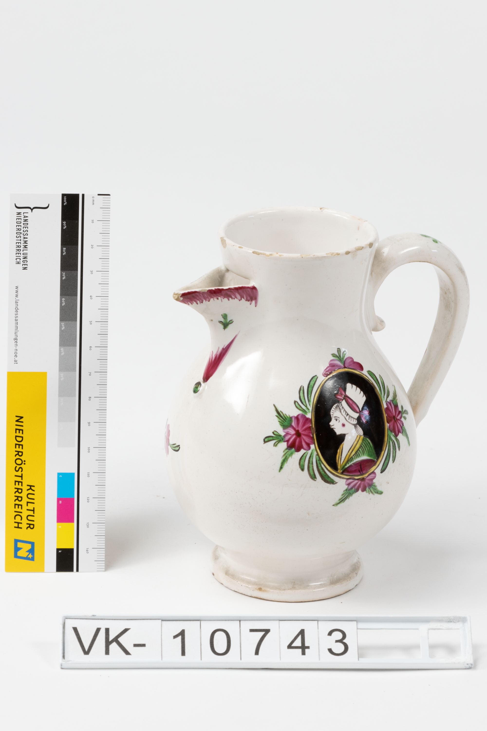 Bauchige Kanne mit unterrandständigem Henkel, einem spitzen Schnabel, abgesetzter Fußzone und mehrfärbiger Bemalung (Damenportrait, Blüten, Blätter).