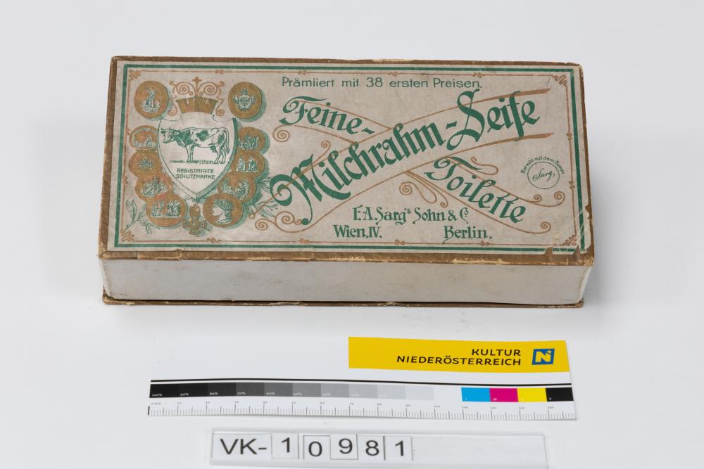 Graue Kartonschachtel, auf dem Deckel befindet sich die Beschreibung des Produkts: "Feine Milchrahm-Seife" etc.