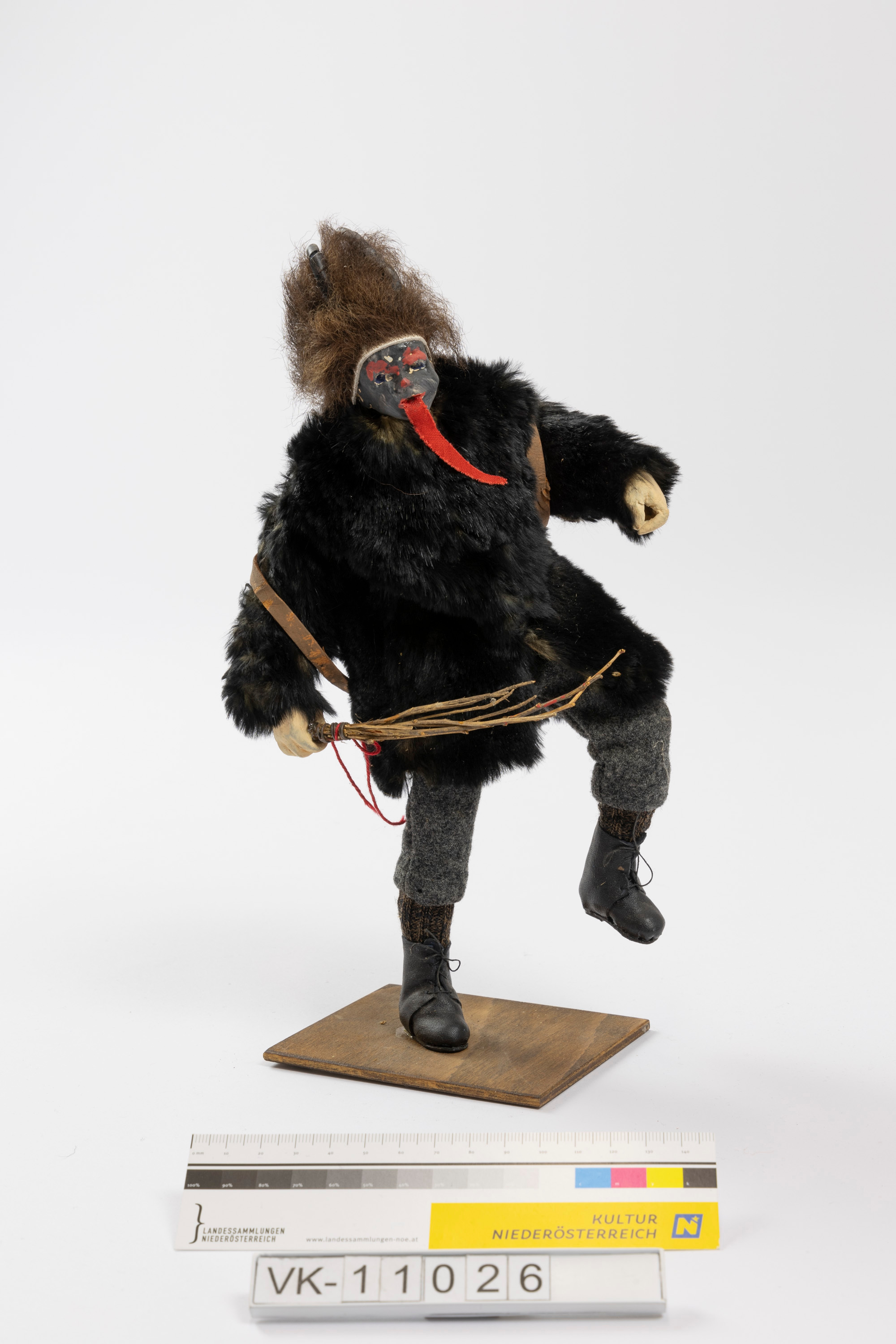 Krampusfigur mit Pelzjacke und Rute auf einer Holzplatte.