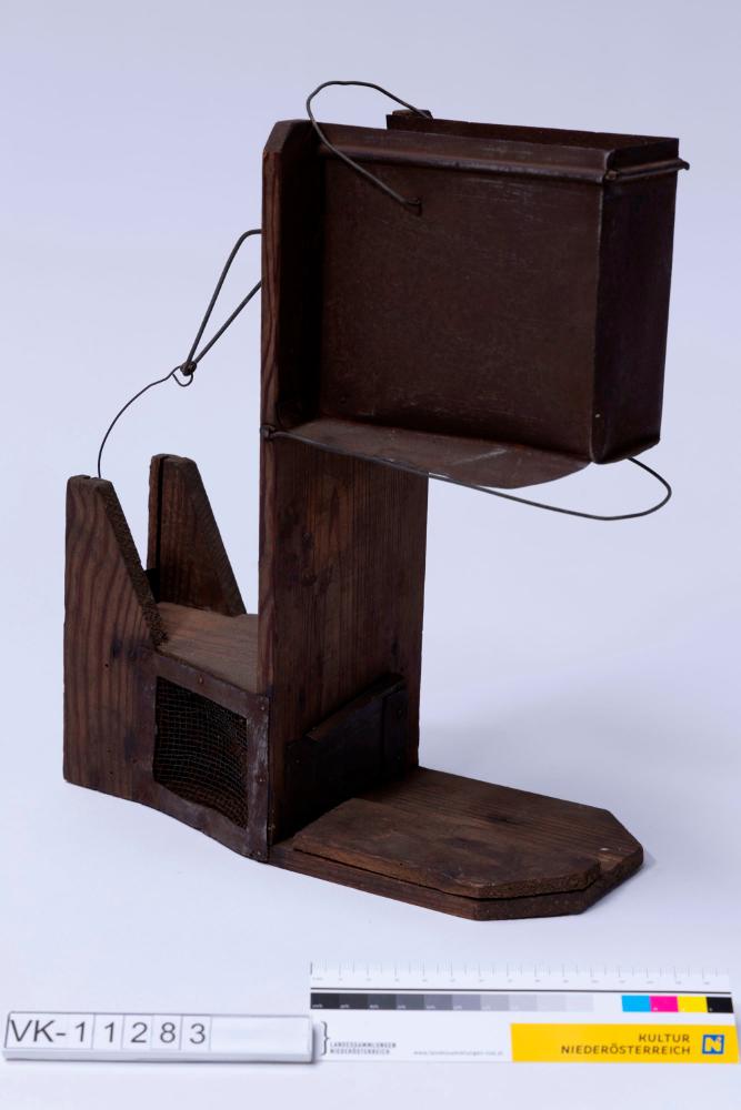 Lebend-Mausefalle aus Holz mit Drahtgitterelementen; der Eingang führt in einen senkrechten Gang, von dem die Maus über eine Klappe in ein Aufbewahrungsbehältnis fällt. Auf der Falle ist eine Gebrauchsanweisung aufgeklebt.