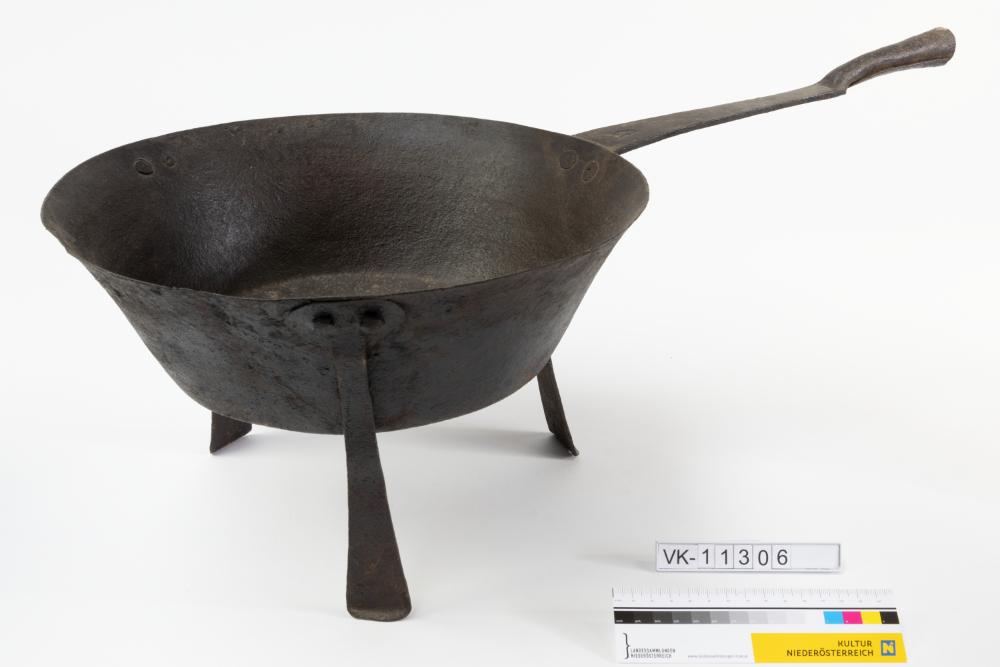 Eiserne Dreifußpfanne mit einem Stiel, dessen Ende zu einem tüllenförmigen Griff geformt ist. Im Bereich des Stielansatzes befindet sich ein Schmiedezeichen.