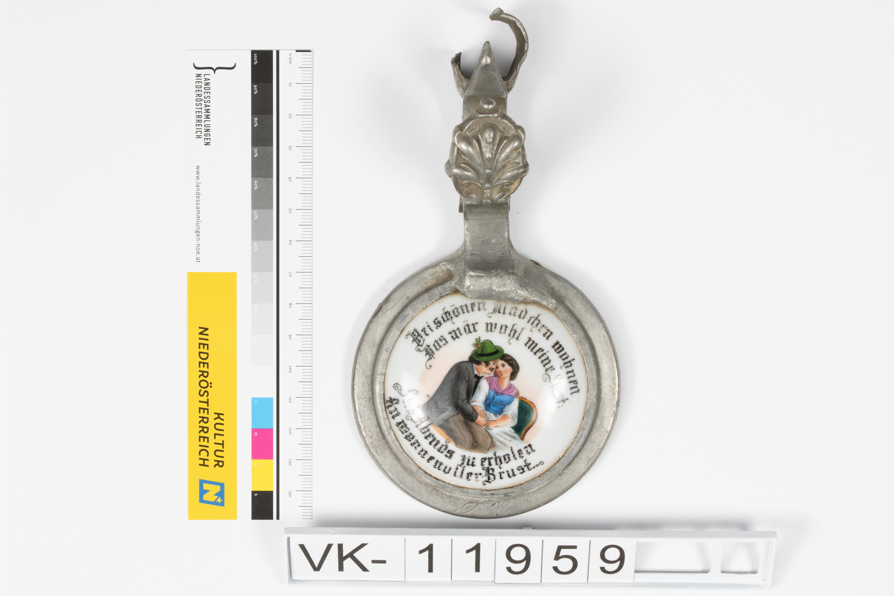 Zinndeckel für einen Krug mit einem Einsatz aus Porzellan mit mehrfärbiger Bemalung: Darstellung eines Pärchens, dazu die Aufschrift: "Bei schönen Mädchen wohnen Das wär wohl meine Lust Sich abends zu erholen An wonnevoller Brust".