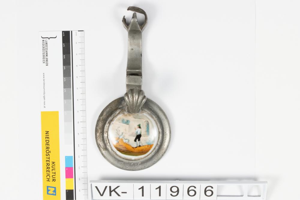 Zinndeckel für einen Krug mit einem Einsatz aus Porzellan mit mehrfärbiger Bemalung: Darstellung eines Hirten mit Tieren in der Landschaft und den Buchstaben "IL".