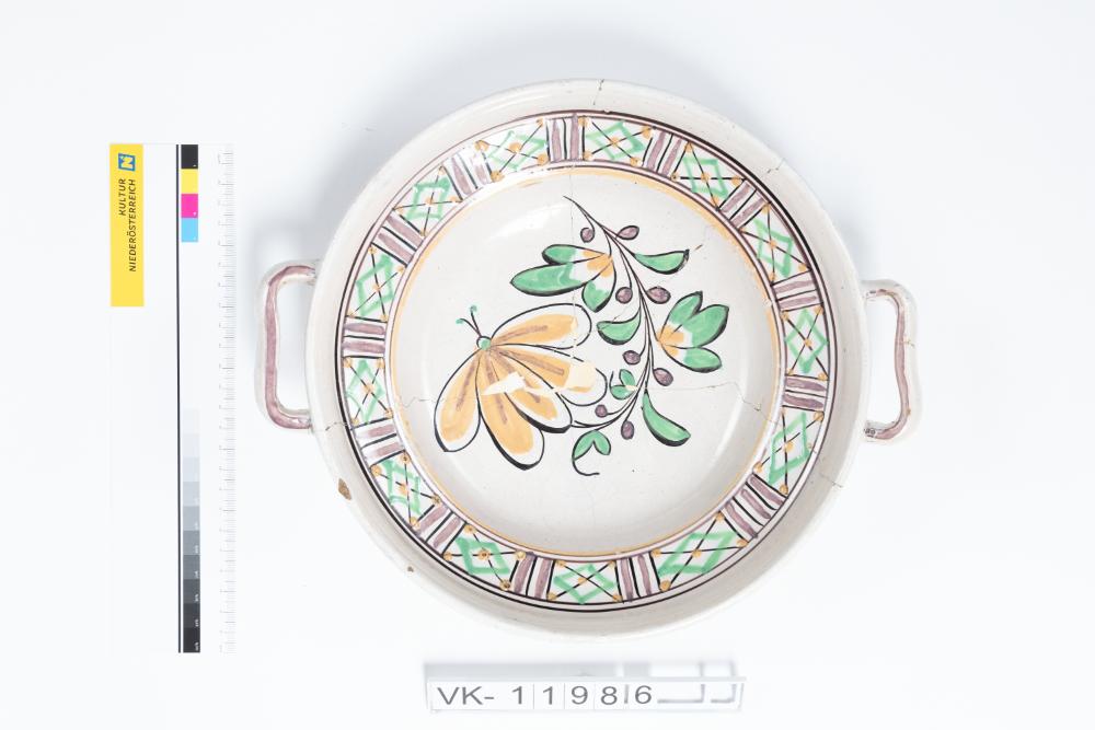 Majolika-Schüssel mit zwei Henkeln und mehrfärbiger floraler Bemalung.