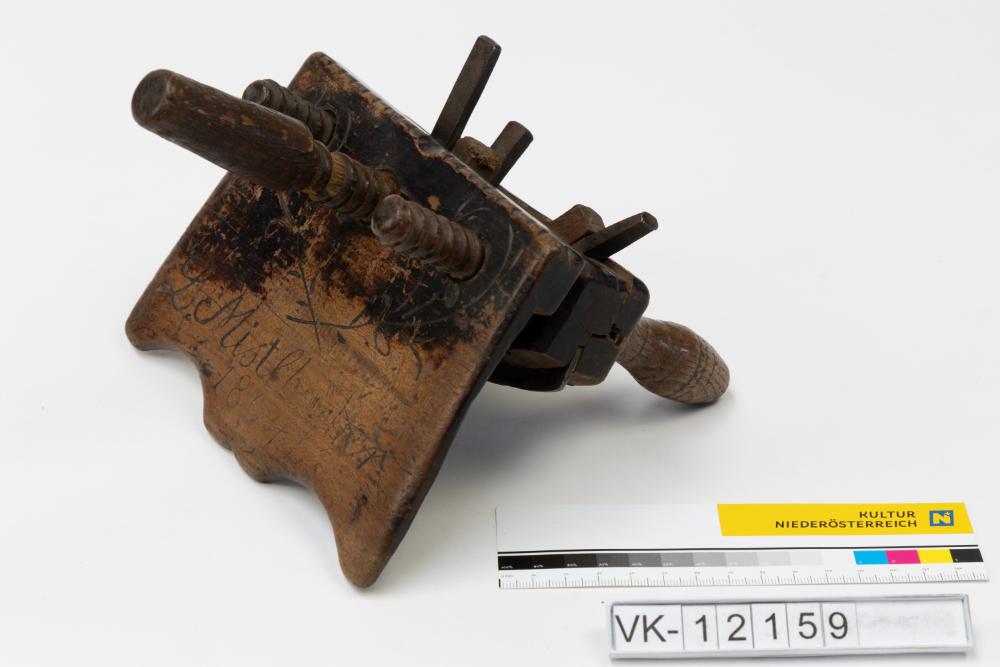 Nuthobel mit schmalem Hobeleisen und einer Führung, die über drei Holzgewinde einstellbar ist. Auf der Führung befindet sich eine eingebrannte Beschriftung: "L. Mistlbacher 1864".