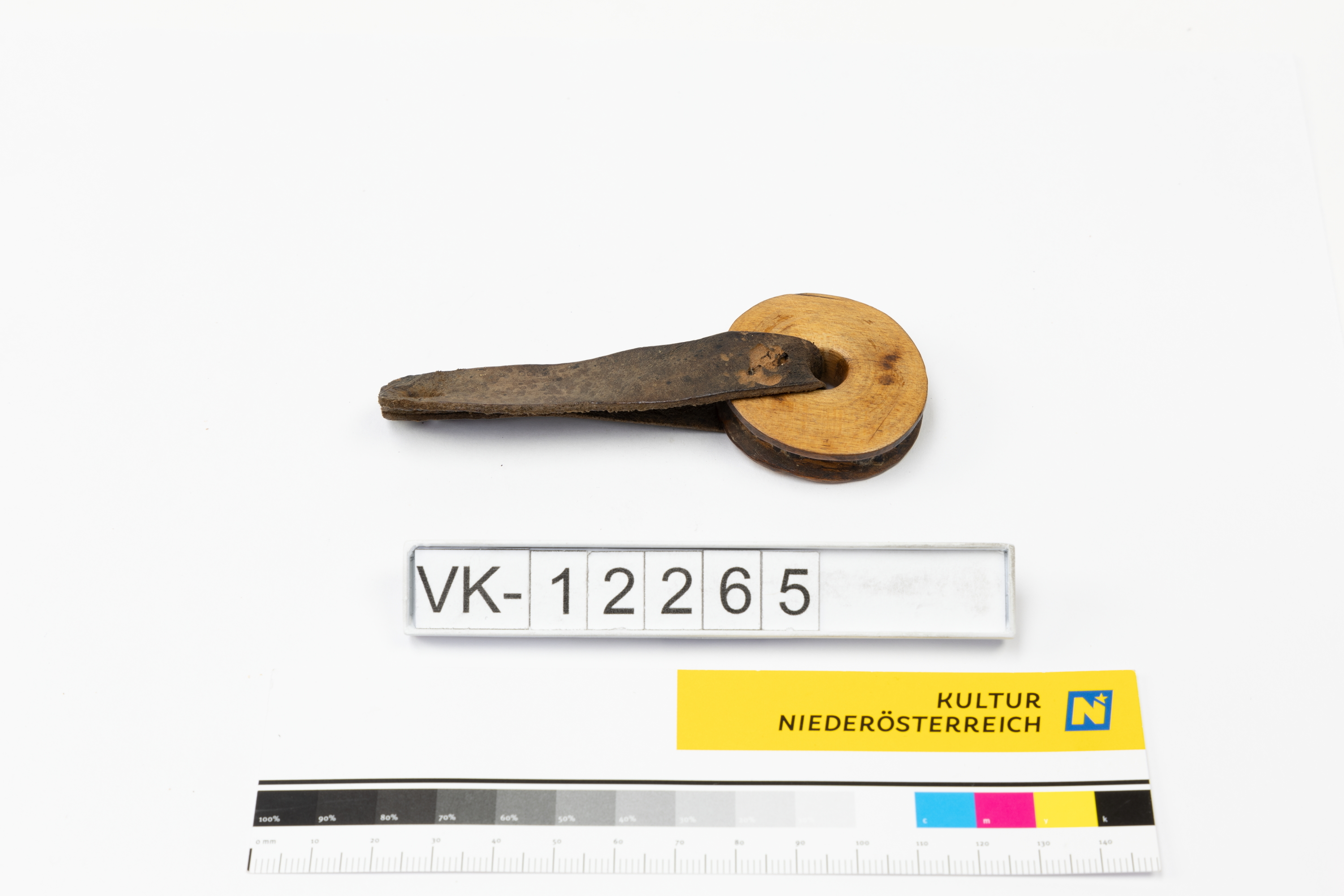 Spinnradteil: Umlenkrolle an einem Lederriemen.