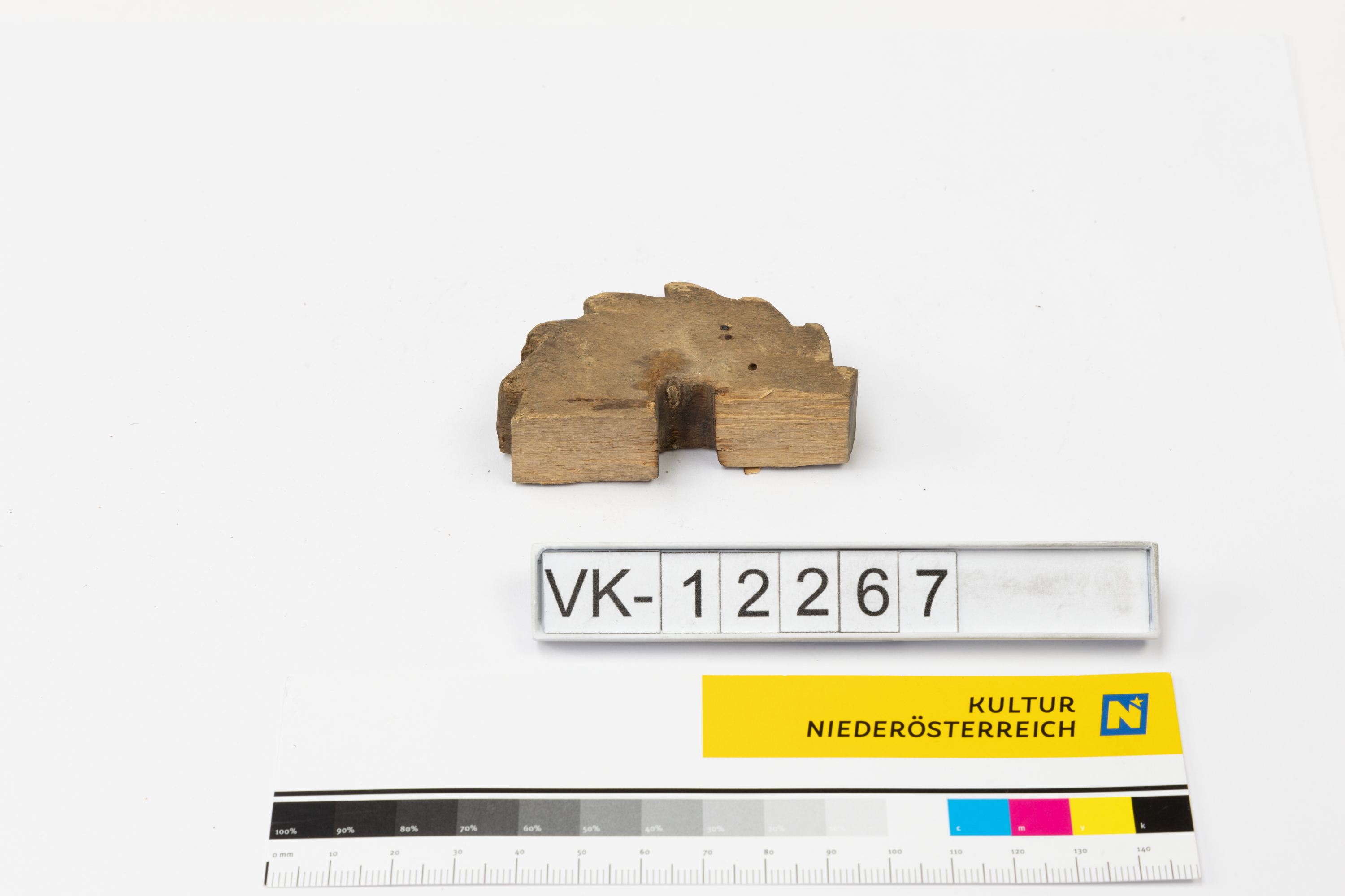 Spinnradteil: Die Hälfte eines kleinen Holzzahnrades.