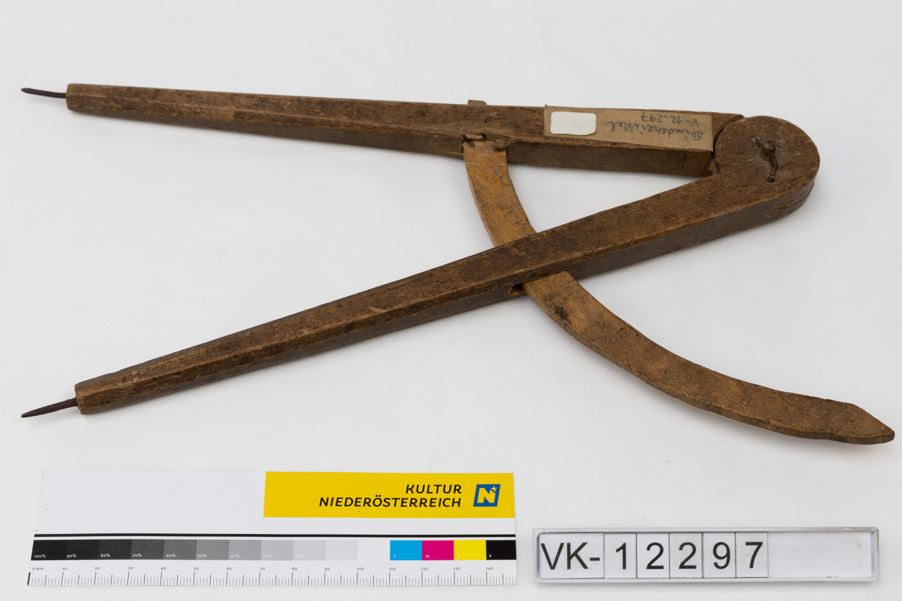 Hölzerner Zirkel mit zwei Metallspitzen.
