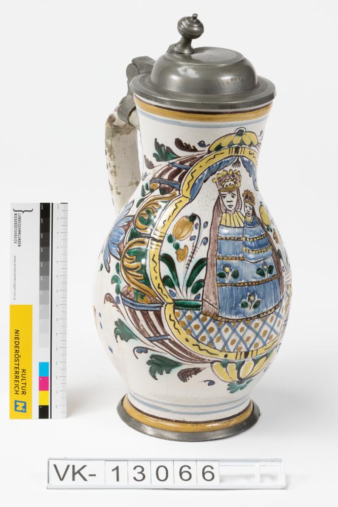 Leicht bauchiger Fayencekrug mit unterrandständigem Henkel, einem am Henkel montierten Zinndeckel, einem Zinnring im Fußbereich und mehrfärbiger Bemalung: Florale Motive, Mariazeller Madonna.
