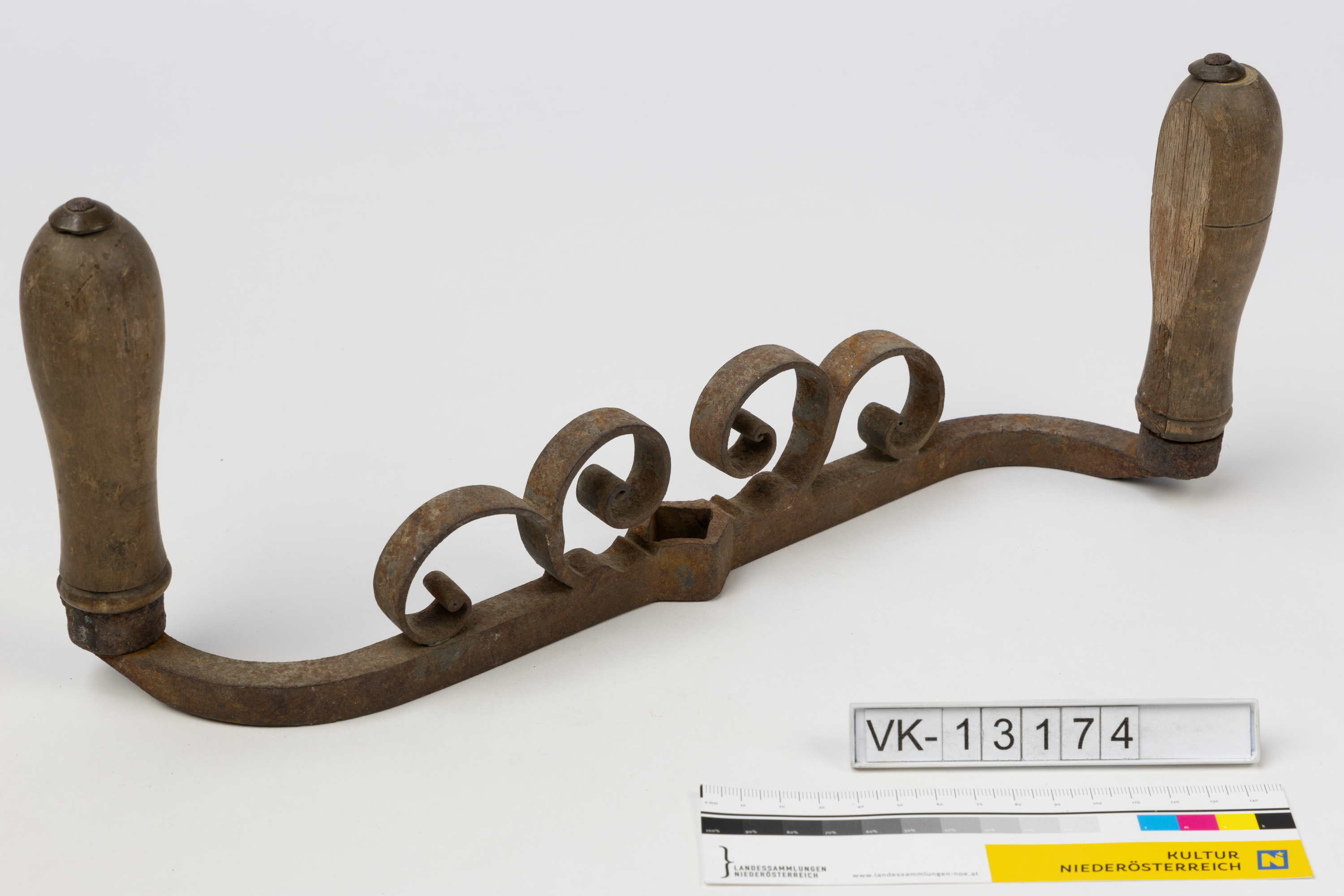 Kurbel mit zwei Holzgriffen, Vierkantaufnahme und angeschmiedeten Ziervoluten.