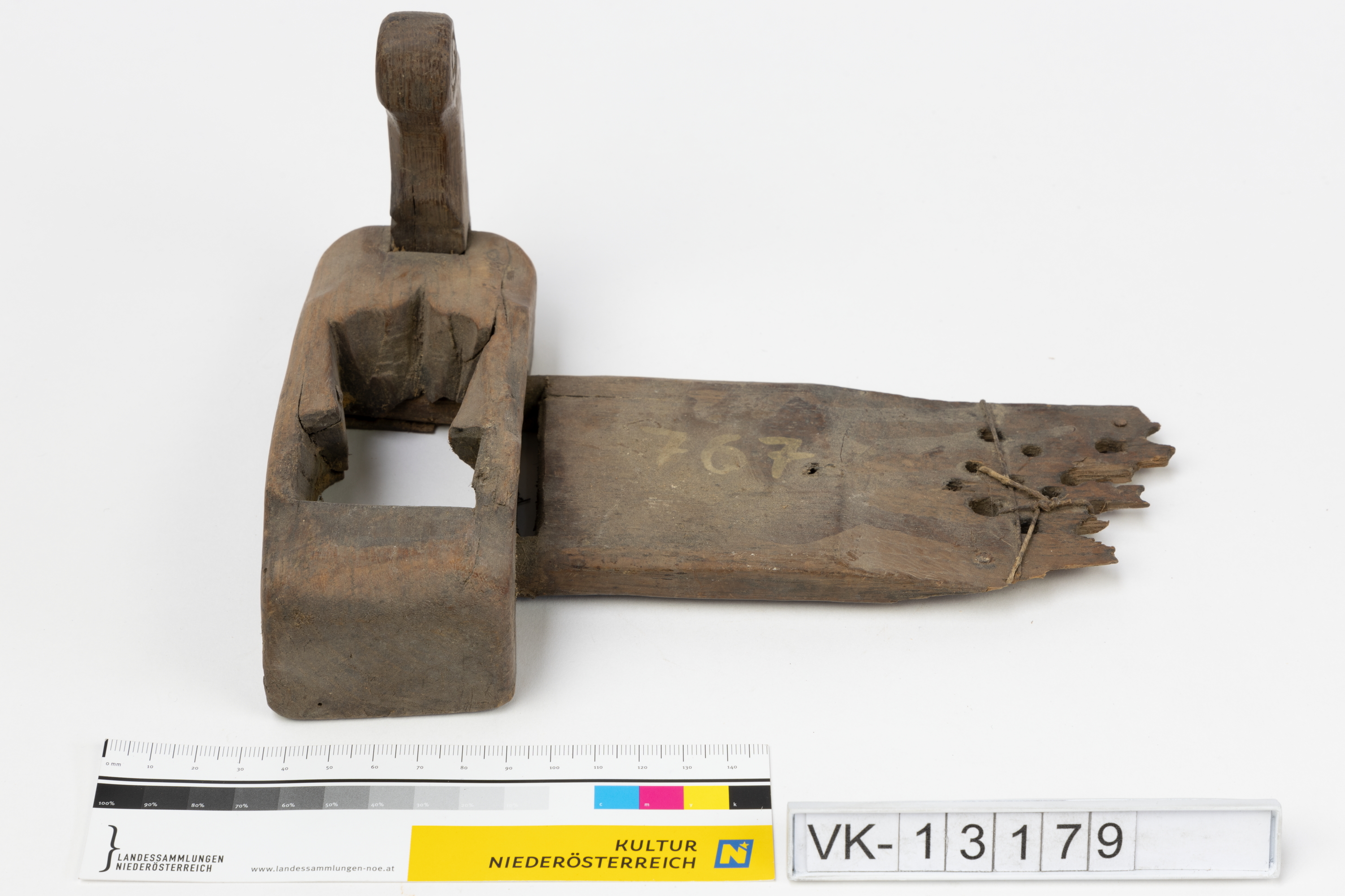 Hobel mit einem in einer Volute endenden Griff und dem Rest einer mehrfach gelochten Führung.