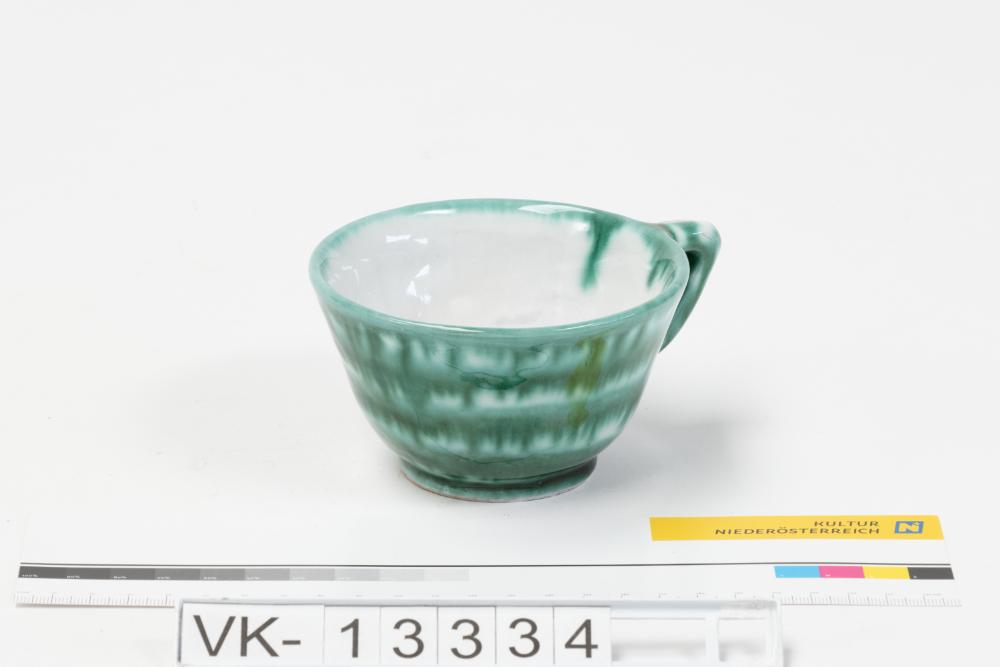 Innen weiß und außen grün marmoriert glasiertes, konisches Häferl mit einem Henkel.