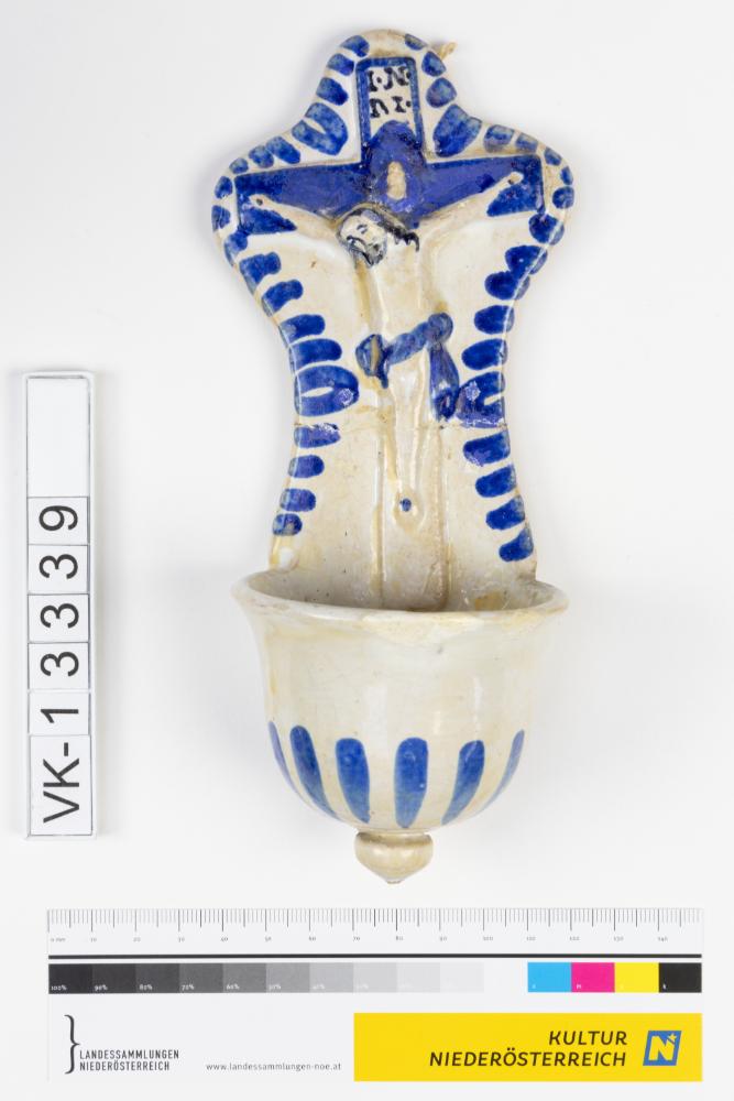 Weihbrunnkessel mit Kruzifix aus weiß glasierter Keramik mit blauem Dekor.