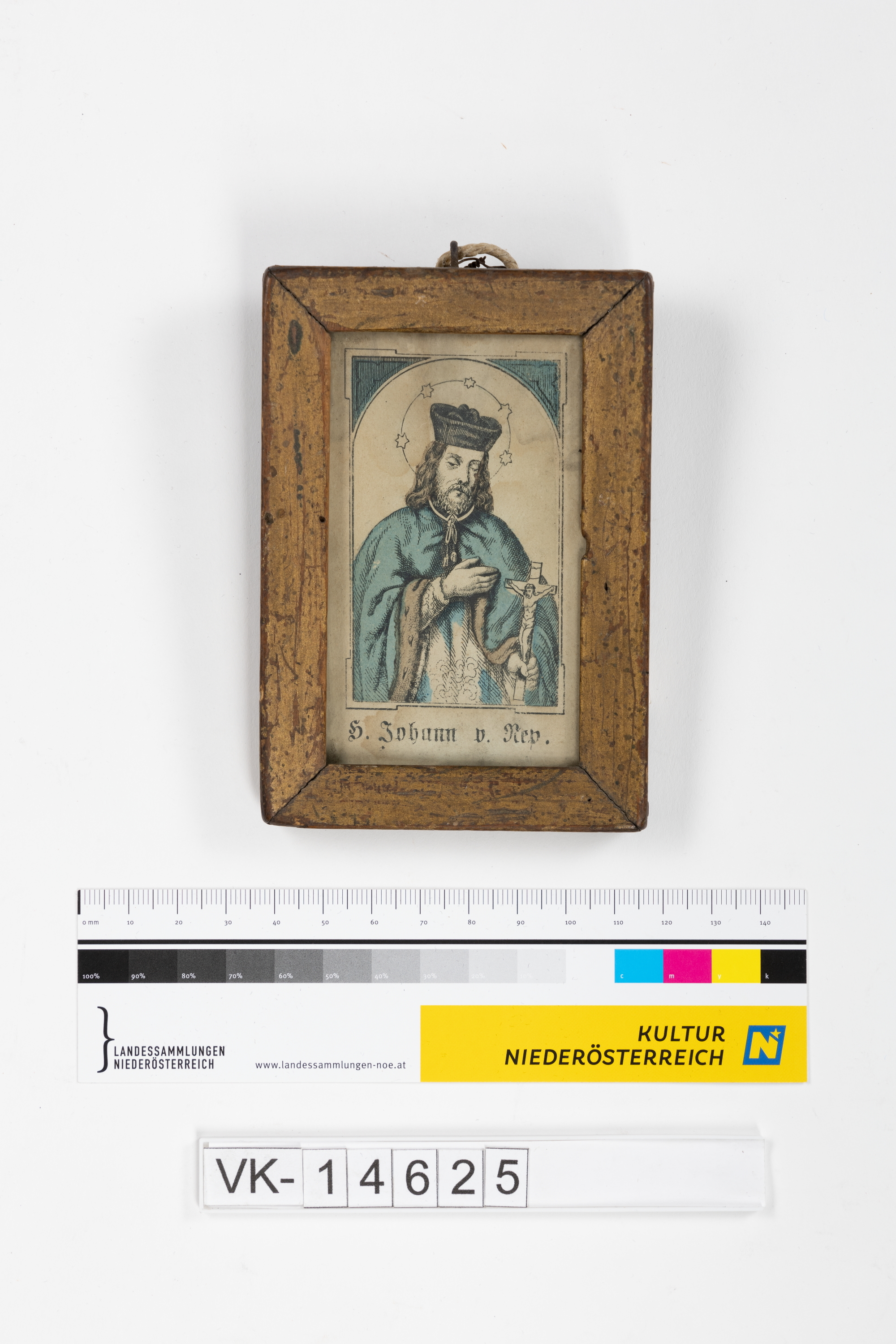 Heiligenbildchen (H. Johann v. Nep.) in einem Holzrahmen hinter Glas.