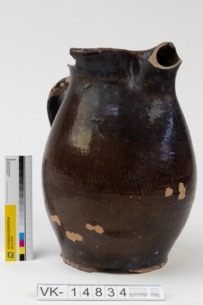 Großer, bauchiger, dunkelbraun glasierter Krug mit Ausguss und schulterständigem Bandhenkel.