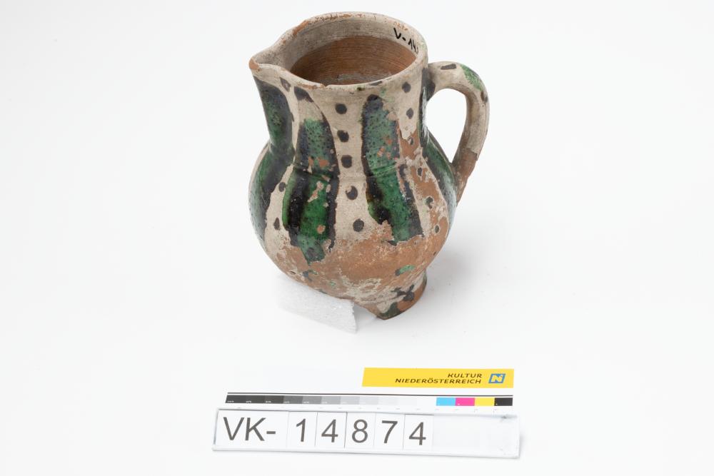 Außen weiß glasierter Krug mit grünen Streifen und braunen Punkten.