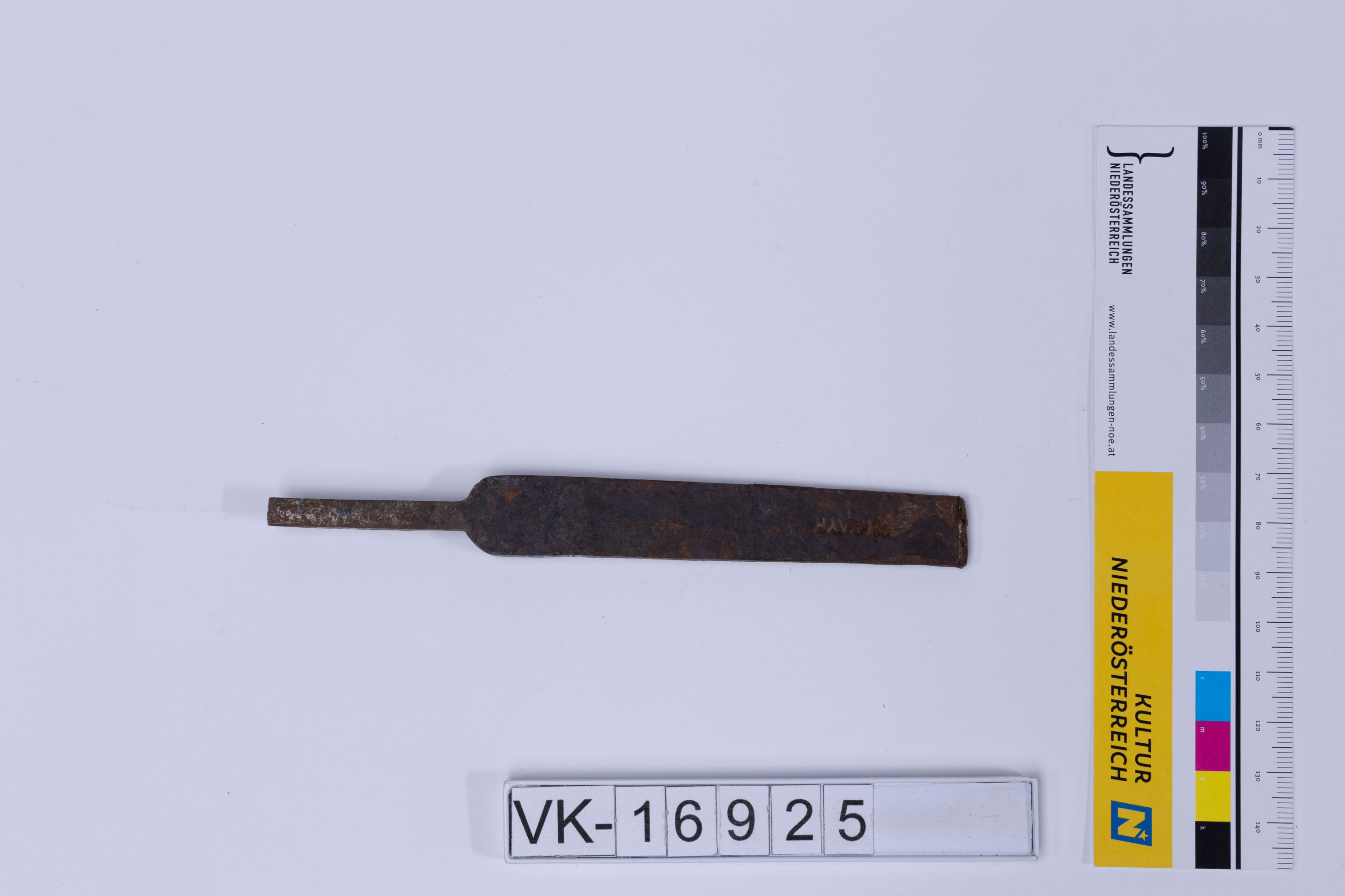 Flacher breiter Meißel ohne Griff, mit nicht vollständig erkennbarer Prägung.