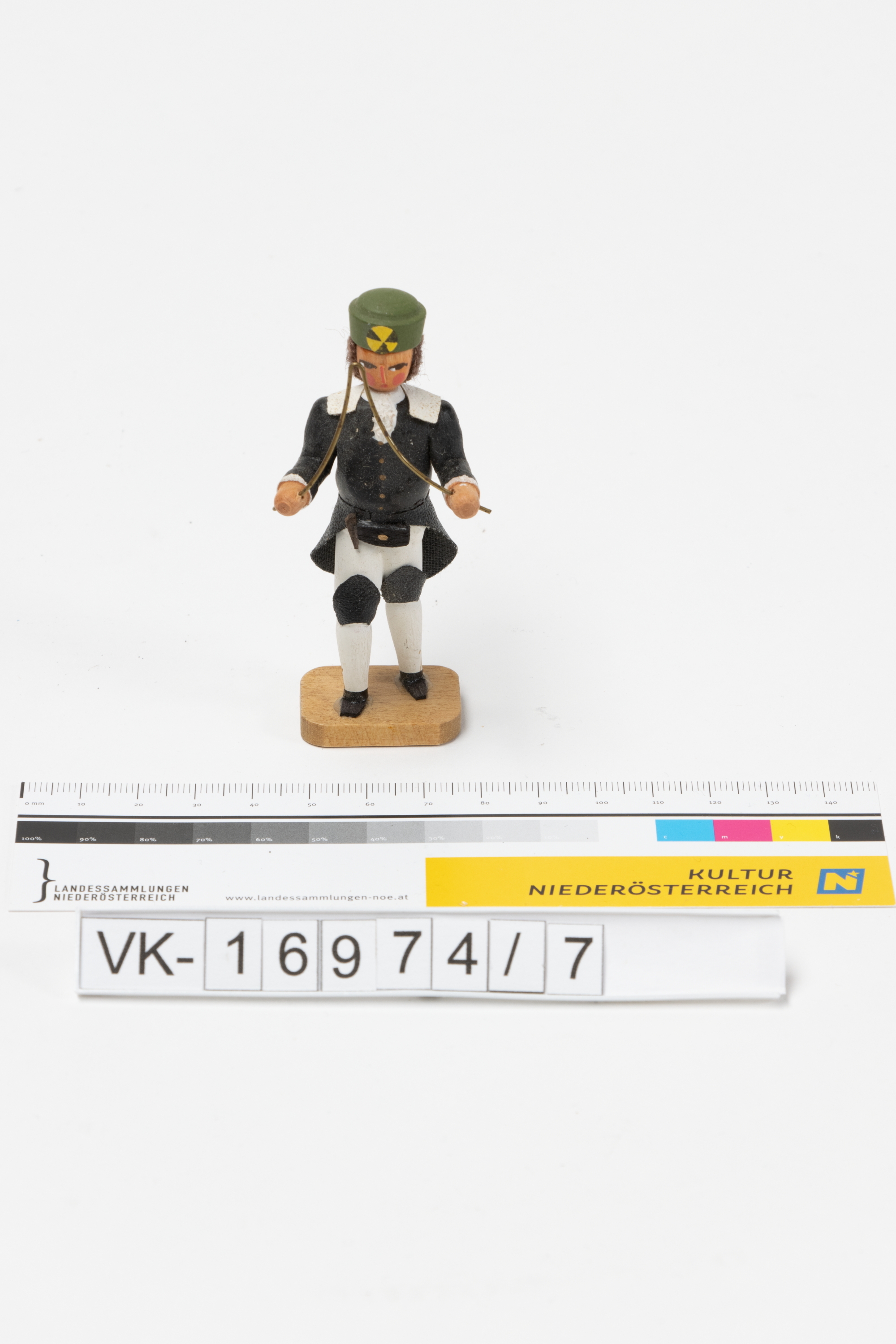 Kleine Holzfigur: Mann mit schwarz-weißer Uniform, dunkelgrüner Kappe und einem Drahtbügel zwischen den beiden Händen. Auf dem Sockel befindet sich unten ein Aufkleber: Darstellung eines Wappens (Marke) mit "WW" und der Aufschrift: "4 Rutengeher um 1719 entw. 1982".