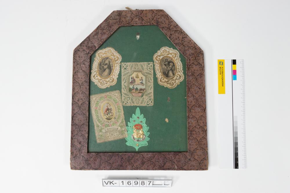 In einem sechseckigen Holzrahmen, der mit violettem Papier beklebt ist, befinden sich hinter Glas fünf Heiligenbildchen aus Papier auf grünem Hintergund. Die Bildchen sind teilweise schwarz-weiß und teilweise färbig bedruckt, eines ist aus Goldpapier geprät. Die Bildchen stammen aus Raabs, Drosendorf und Pulkau.