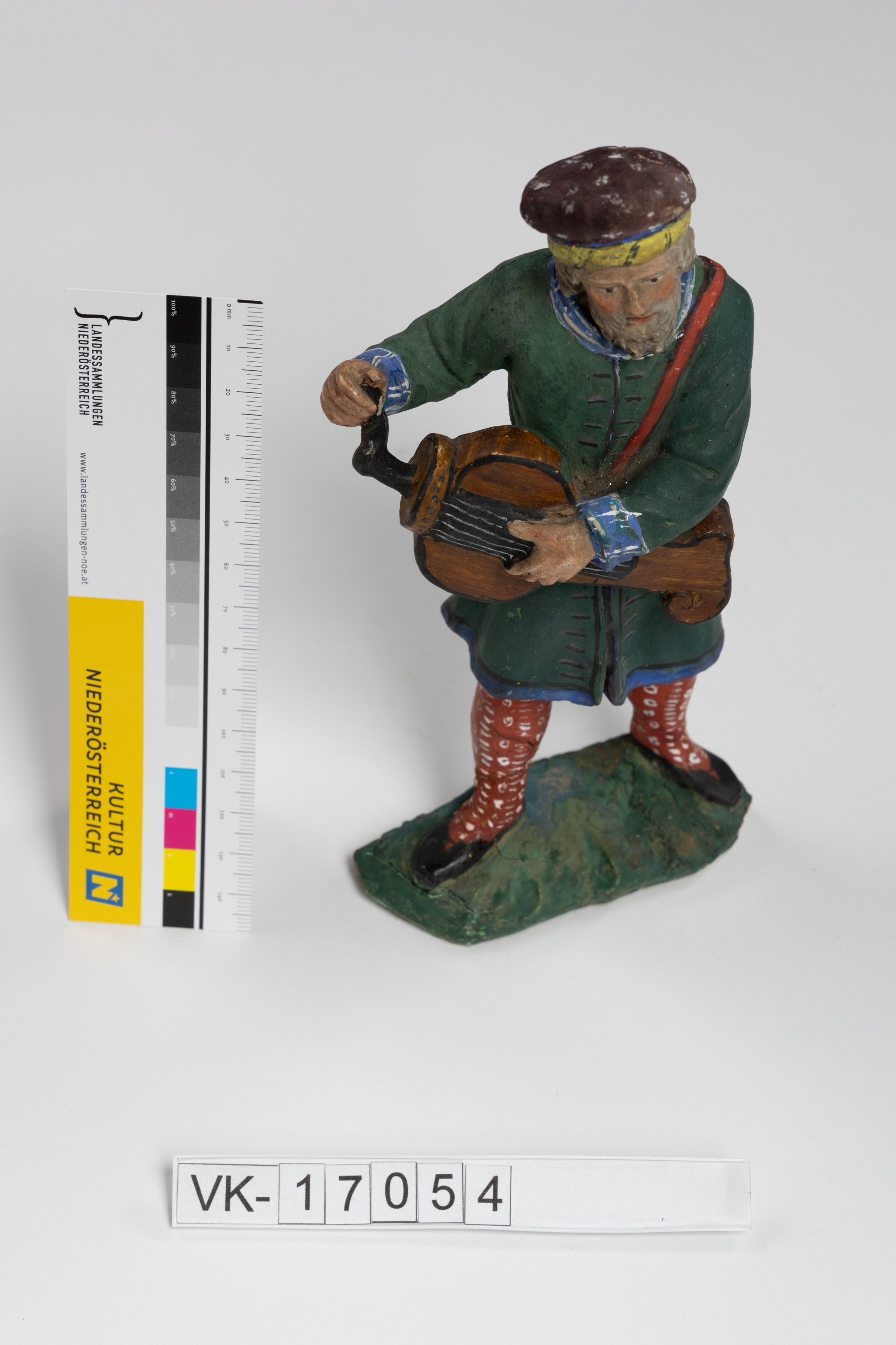 Bemalte Krippenfigur aus Gips auf einer Holzplatte: Stehender Musikant mit grünem Rock und roten Strümpfen.